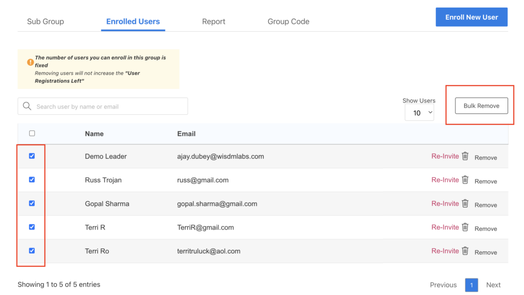 The Group Leader can also bulk remove multiple users from a particular group by checking the checkbox at the start of every user entry and clicking on the Bulk Remove Button.