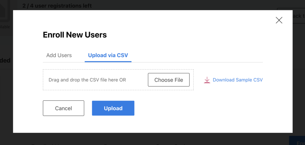Group Leaders can upload a CSV file to enroll members to the group. The format for the CSV file needs to be: First Name, Last Name, Email id.