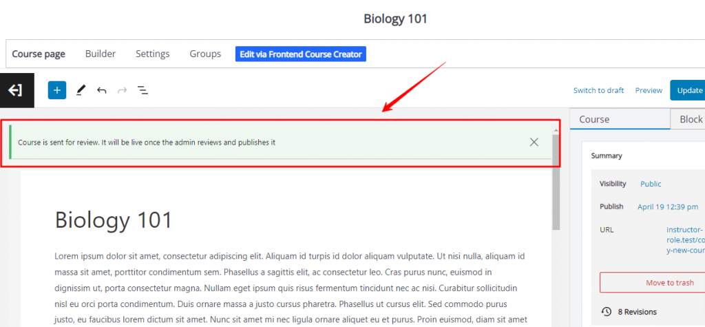 Once the Review Course setting is enabled, Instructors would see a notification whenever they try to Publish or Update a course from either the dashboard or Frontend Course Builder.
