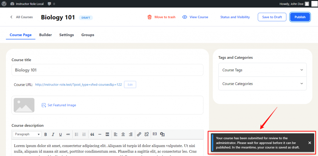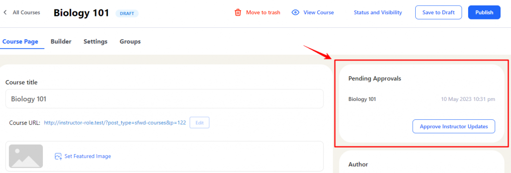 Once a course is sent for review its status is set to Draft and on the course listing page they can see a new column named Pending.