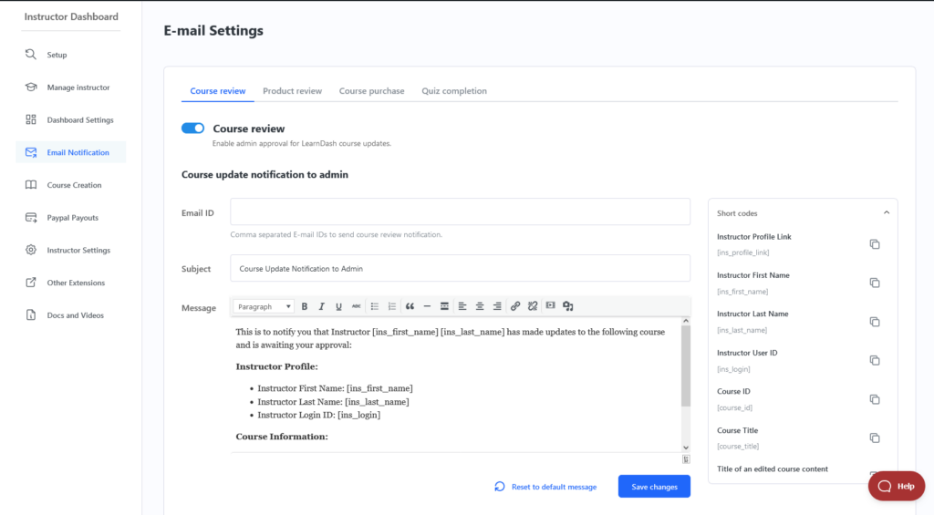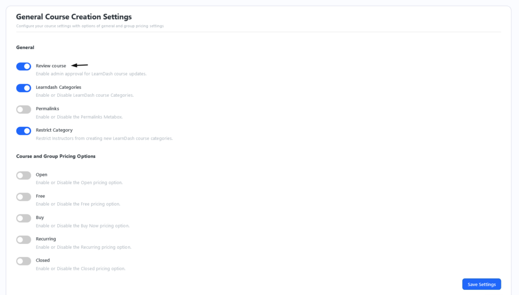 The administrator can enable course reviews from the instructor settings from LearnDash LMS → Instructor → Course Creation under the Settings Tab.