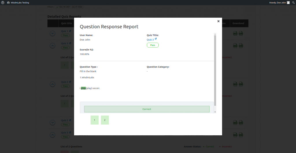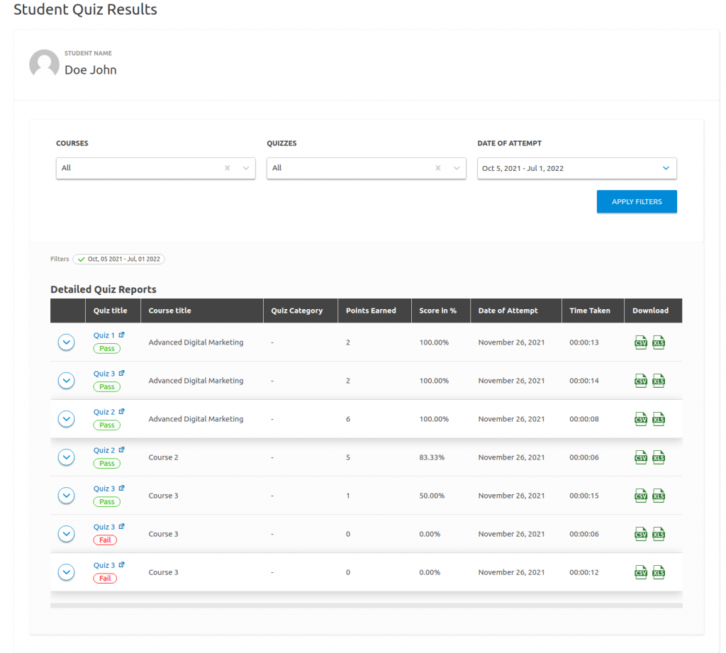As you can see in the above screenshot, the user can filter the results based on Courses, Quizzes and Date of Attempt.
