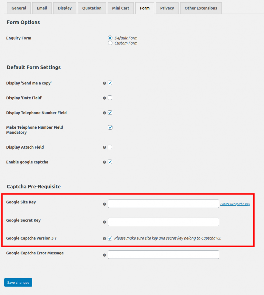 - Make sure that you have entered the correct values for the settings ‘Google Site Key’ and ‘Google Secret Key’. These settings are found under Product Enquiry Pro menu > Settings submenu > Form tab > Captcha Pre-Requisite section.