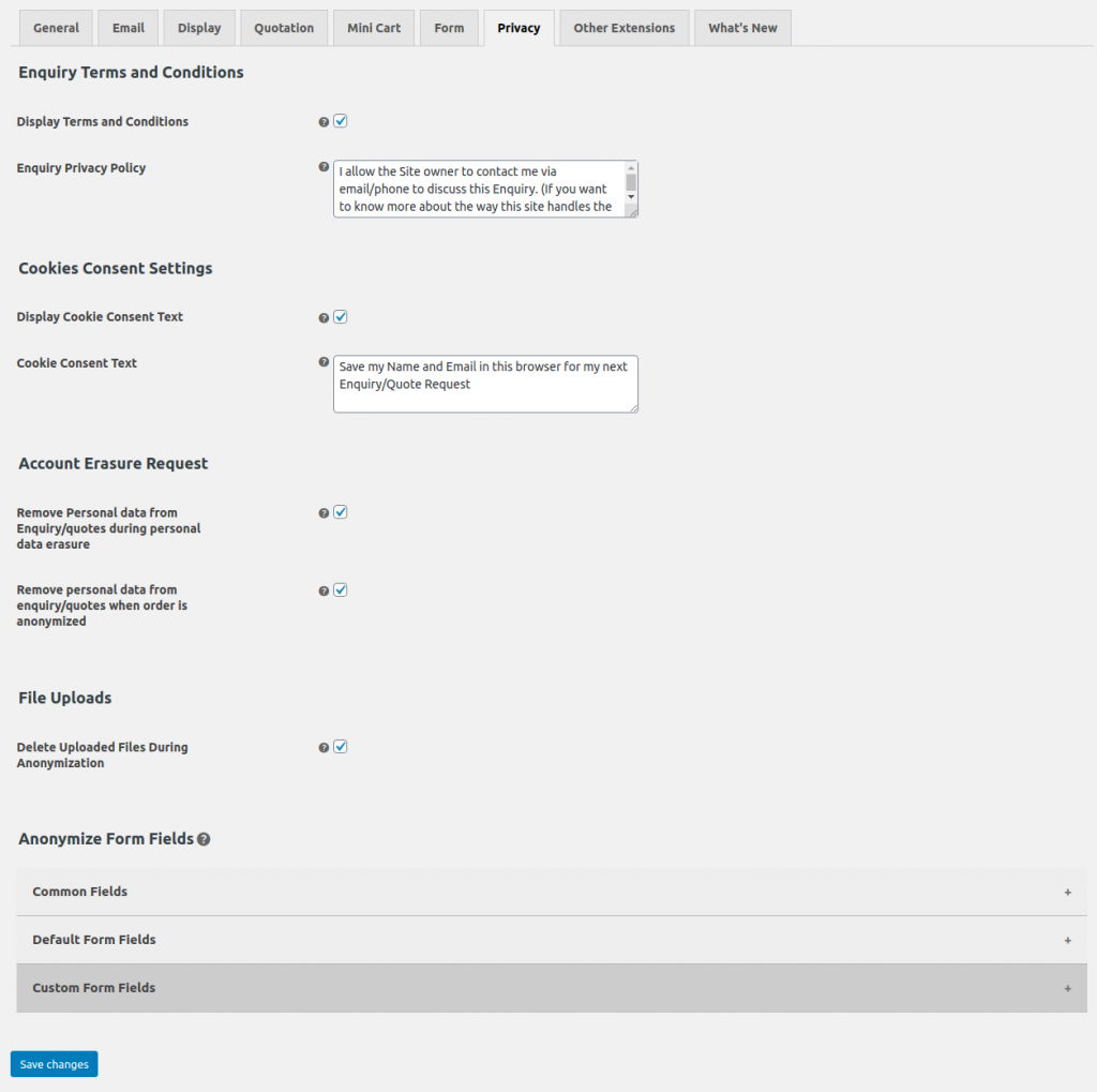 This sub-section contains the form fields which are present in the default enquiry form. Check the form fields which may contain the user’s personal data, so those data can be removed during the anonymization process.